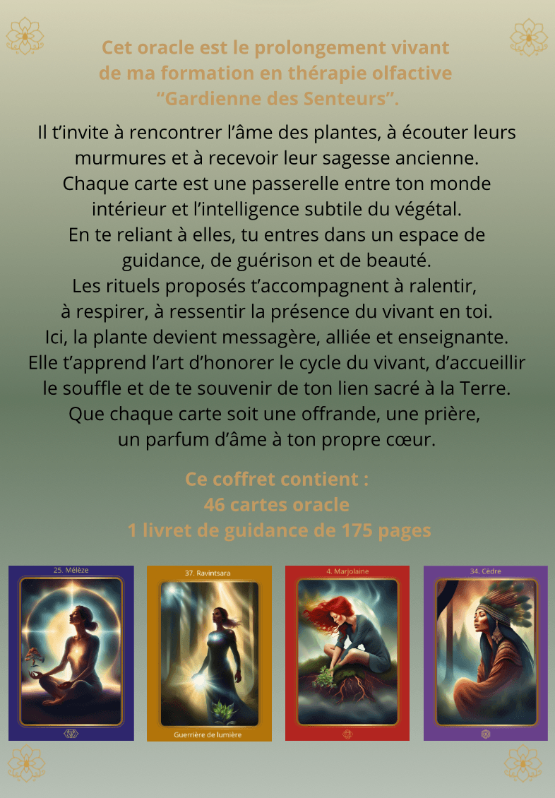 Cet oracle n’est pas un outil divinatoire : c’est une porte d’accès au monde végétal, un miroir de ton chemin intérieur, une invitation à te relier à la sagesse subtile des plantes.